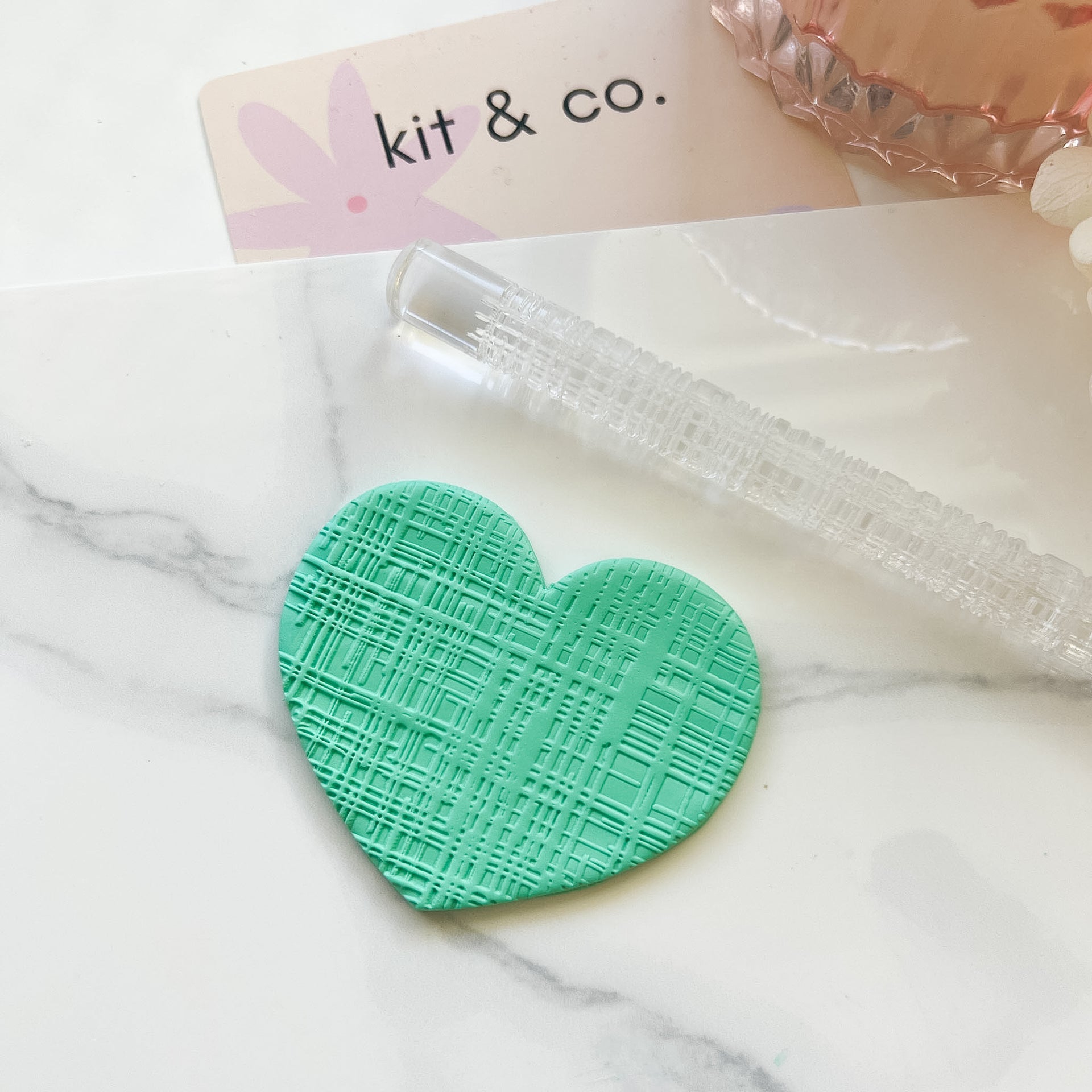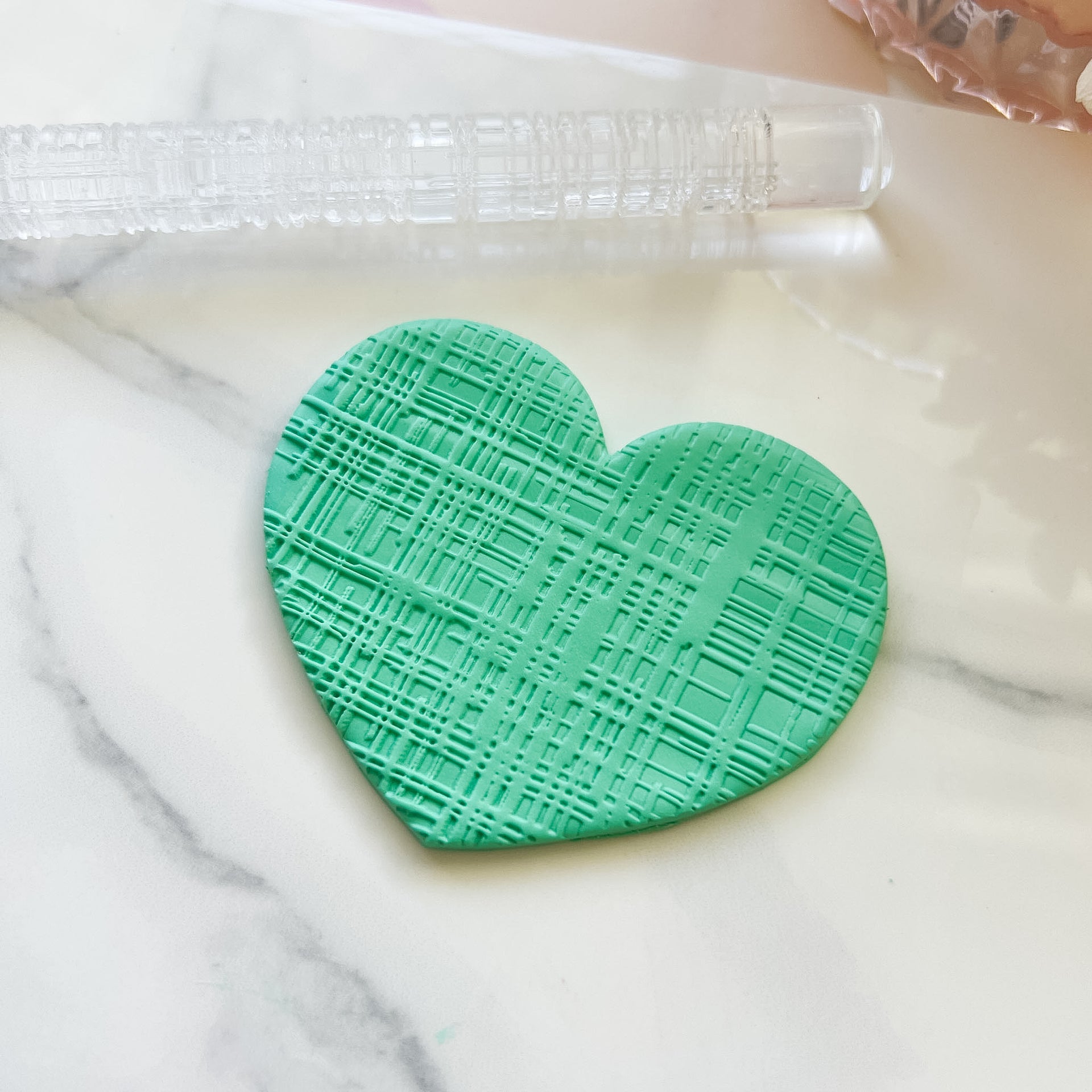 Engraved acrylic texture roller for use with fondant or polymer clay. Images show the effect of the roller on polymer clay.