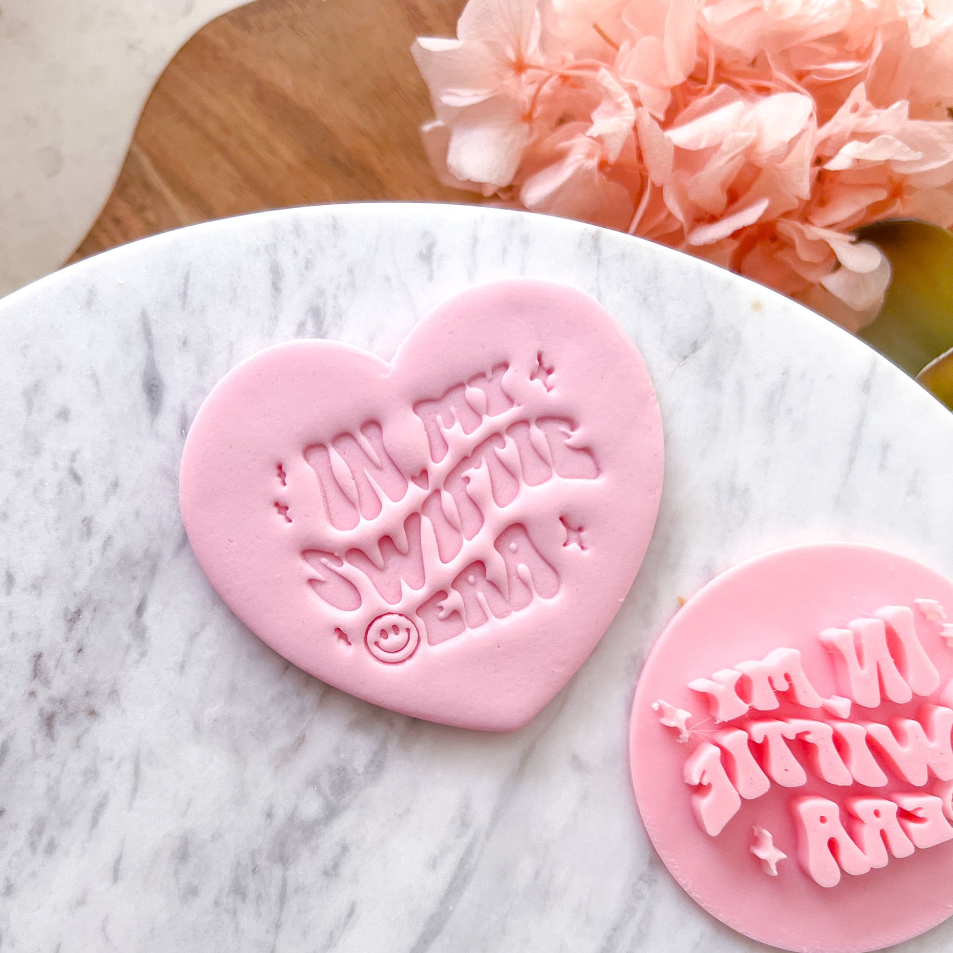 Create gorgeous fondant decorations in seconds with our In My Swiftie Era Fondant Stamp. Easy to use and perfect for all kinds of themed cookies and fondant designs, this stamp helps you achieve beautiful, detailed designs with ease. Approx. size: 0.5 cm.