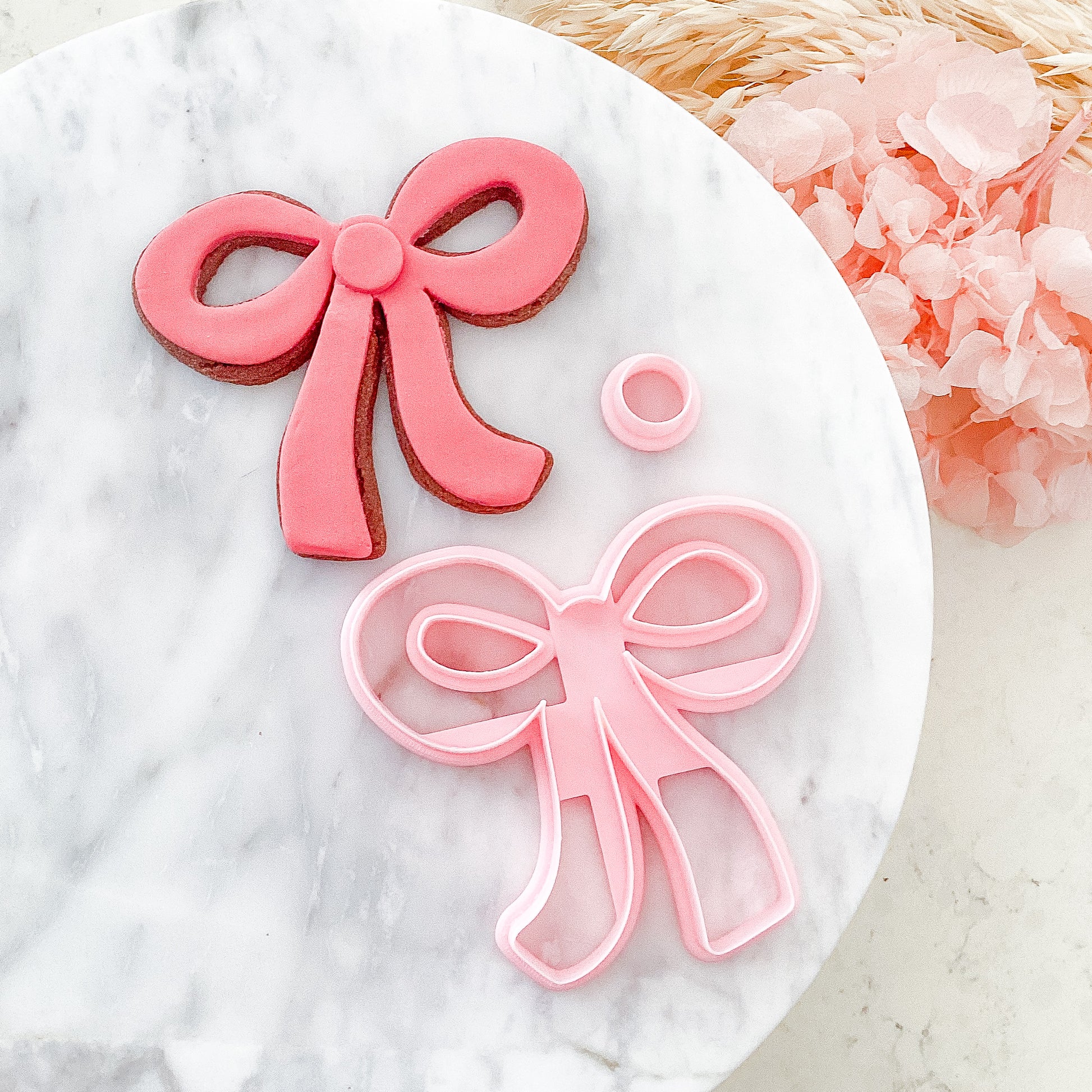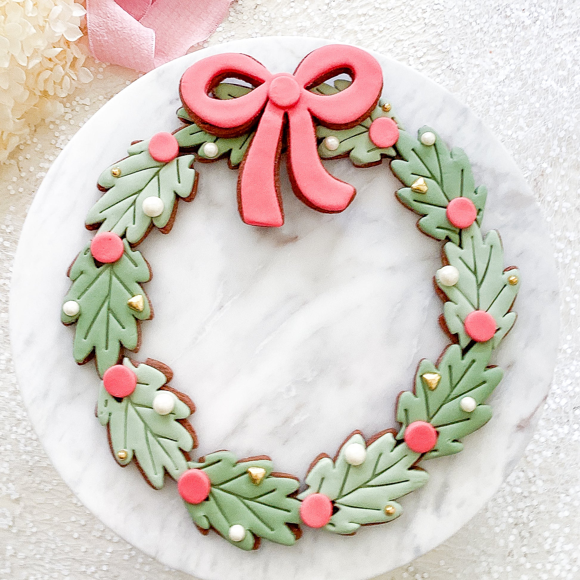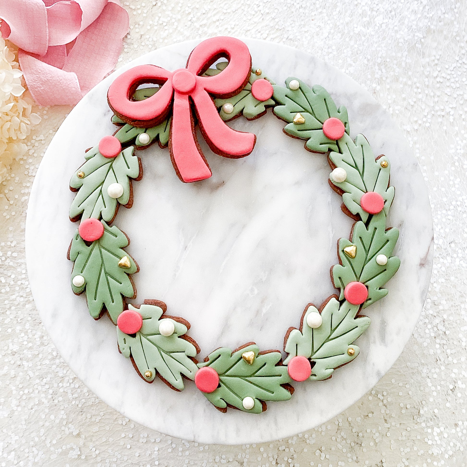 Create a jaw dropping wreath cookie platter! This 4-piece set includes a leaf cutter and matching stamp, and a stunning 2-piece bow cutter designed to together and create a stunning wreath cookie platter, measuring approximately 20 cm wide.